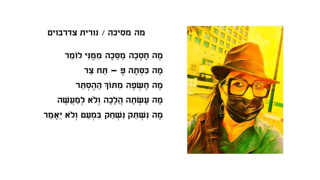 ציינתי כאן למעלה את תקופת הקורונה. בתקופה זו עטינו מסיכות. להלן צילום ציור משלי המשולב עם שירי- אשר התפרסמו באחד מכתבי העת לתרבות ואמנות