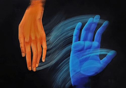 צורת העבודה באקריליק, משיכות המכחול והצבעוניות מספרים גם הם בדרכם את עניין השקיפות. עבודת צבע שנעה בין צבע אטום לצבע שקוף, בתחושה של עירפול וטשטוש. תנועת הידיים מהדהדת לציורי של מיכאל אנג'לו, בריאת האדם בקפלה הסיסטינית, דבר שמעניק משמעות נוספת ליצירה, ומהדהדת לקיום האנושי, בריאה – יצירה – לידה – אדם ואלוהים.