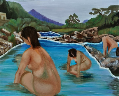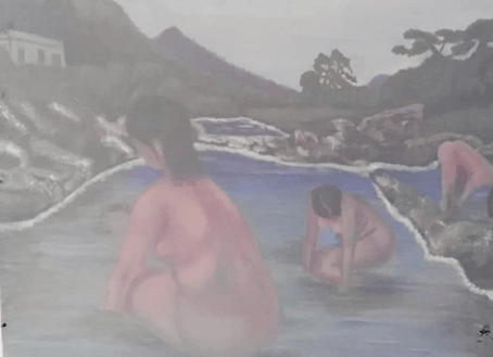 אלדר "דואג לצניעותן " של המתרחצות המיתולוגיות ומכסה אותן בבד, נותן להן כסות והופך את היצירה למעורפלת משהו. לכאורה הוא מכסה, אך הבד שקוף, והציור מבצבץ מבעדו. ניתן לקרוא עבודה זו כמטאפורה למצבם של המתרחצות הנראות, החשופות, השקופות, המתגלות אולי לעצמן במים השקופים, אלה שלאורך דורות תשארנה חקוקות בזכרון הצופים – המתרחצות.