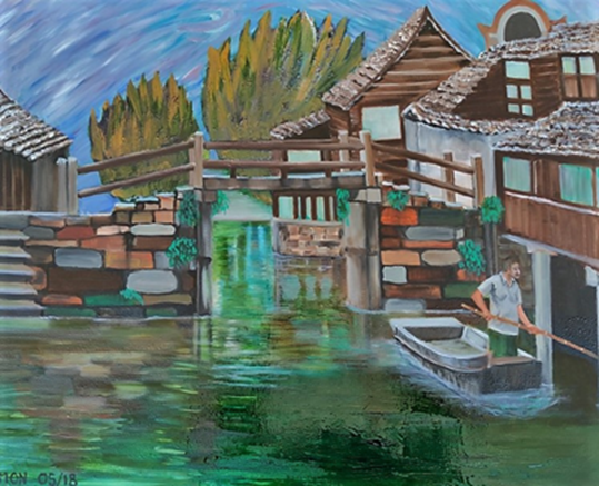 שמעון אלדר מציג שתי עבודות. בשתי העבודות הוא עוסק במים, אם אלה המתרחצות, או אם זה מקום שהוא מים 'ונציה בסין'. המים עצמם כבר מייצרים שרשרת של אסוציאציות בהקשרים שונים של השתקפות.